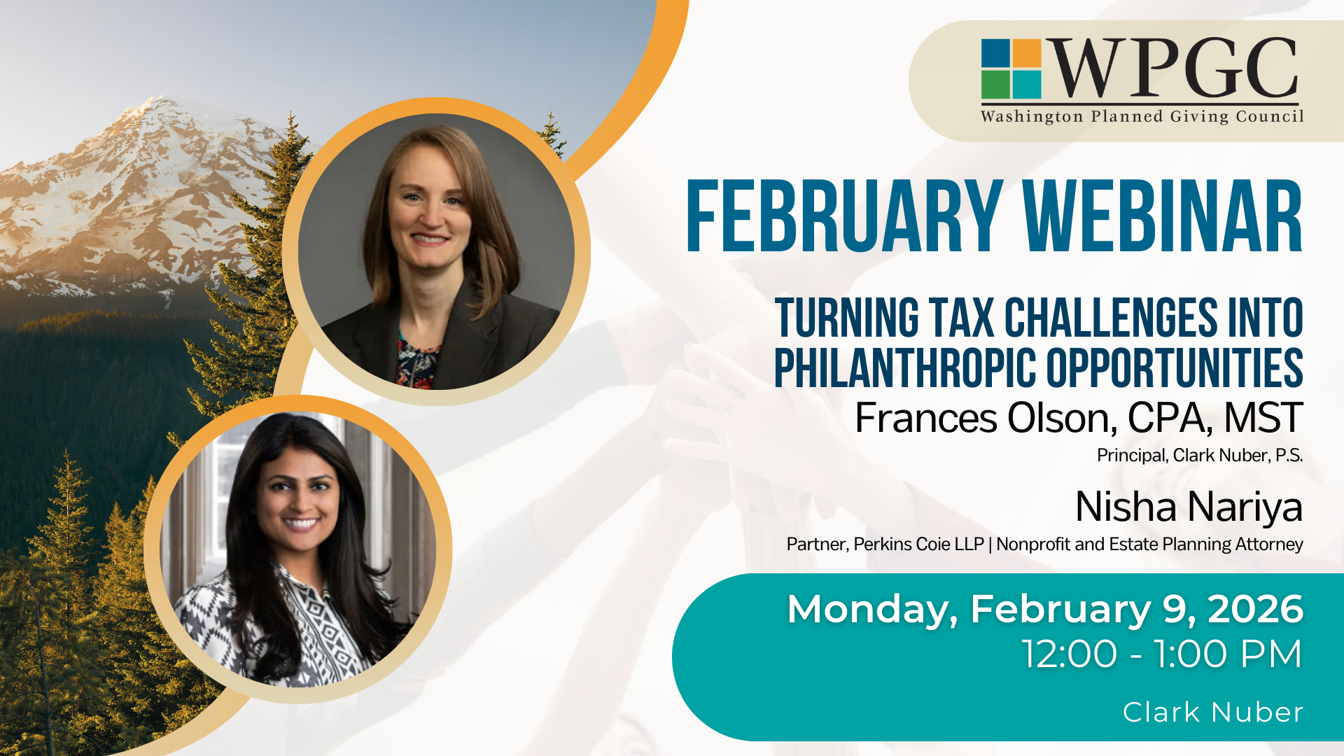 Have you ever wondered what a donor meant when they said their taxes prevent them from making larger charitable gifts? Are you curious to know how new state and federal tax regulations may impact donors' decisions to give? Join us on February 9th to learn about fundamental tax issues that donors face and how planned gift strategies can be used to minimize taxes and maximize philanthropy. Experts Frances Olson, CPA, MST (from Clark Nuber) and Nisha Nariya, JD (with Perkins Coie) will share their insights during a panel session.